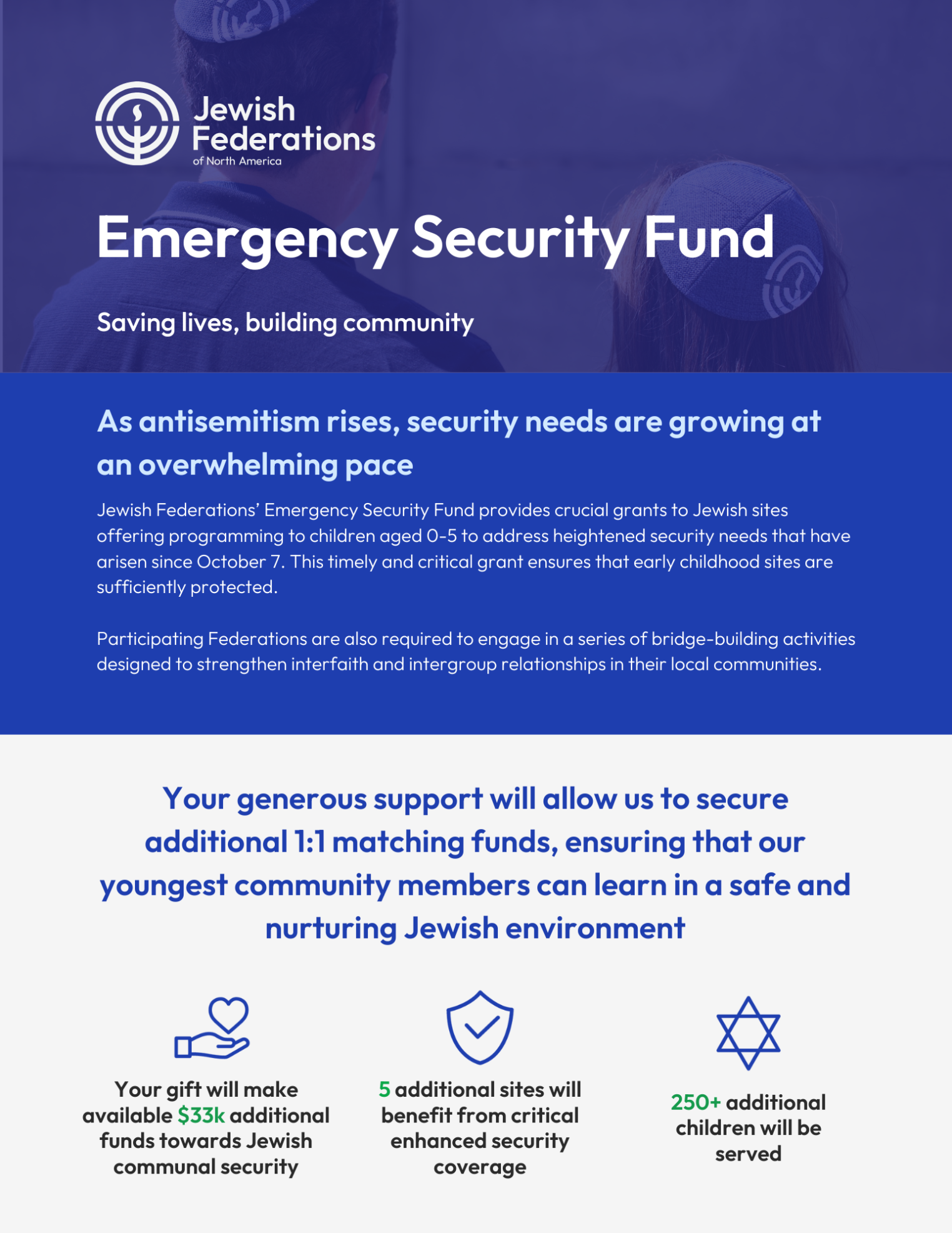 Jewish Federations of North America's grantor is providing our community with another Emergency Security Grant for 2025. The 2025 grant is divided into three parts. The first part of the grant comes from the grantor, the second part comes from donors like you, and the third part is a match from the grantor. This security grant is for security personnel for schools, events, Shabbats, etc., when and where children aged 0-5 years old are in attendance.