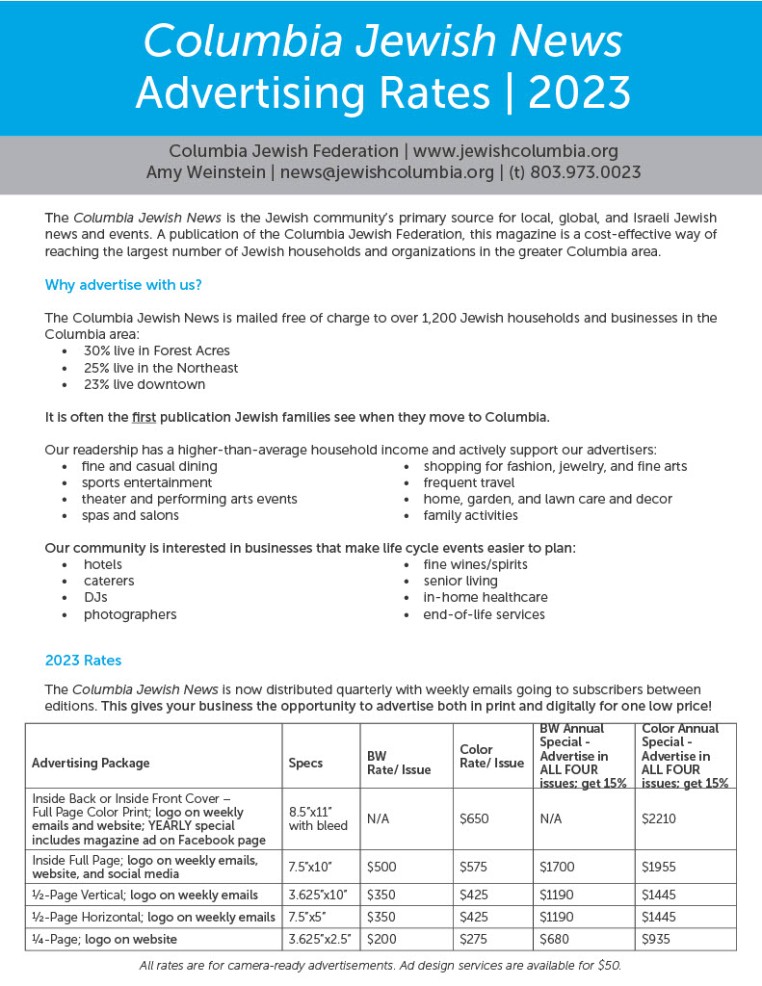 Don’t miss the most cost-effective way of reaching the largest number of Jewish households and organizations in the greater Columbia area! Take advantage of one of our brand-new marketing options today!