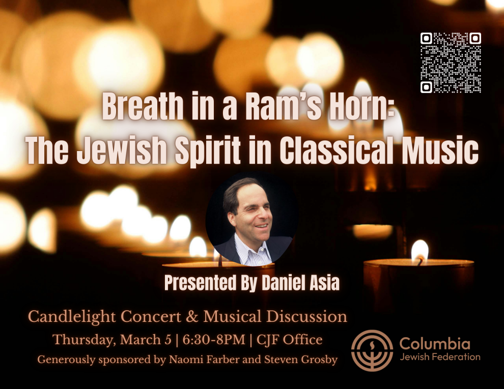 Renowned classical composer Daniel Asia brings you Breath in a Ram’s Horn: The Jewish Spirit in Classical Music, an audience-interactive presentation that delves into the mysteries of Judaism and classical music, their interrelationships, and includes a deep listening of his award-winning music. Click this link for more information: Daniel Asia – Kolot Management Thursday, March 5; 6:30-8 PM 2711 Middleburg Drive, Suite 101 Columbia, SC 29204