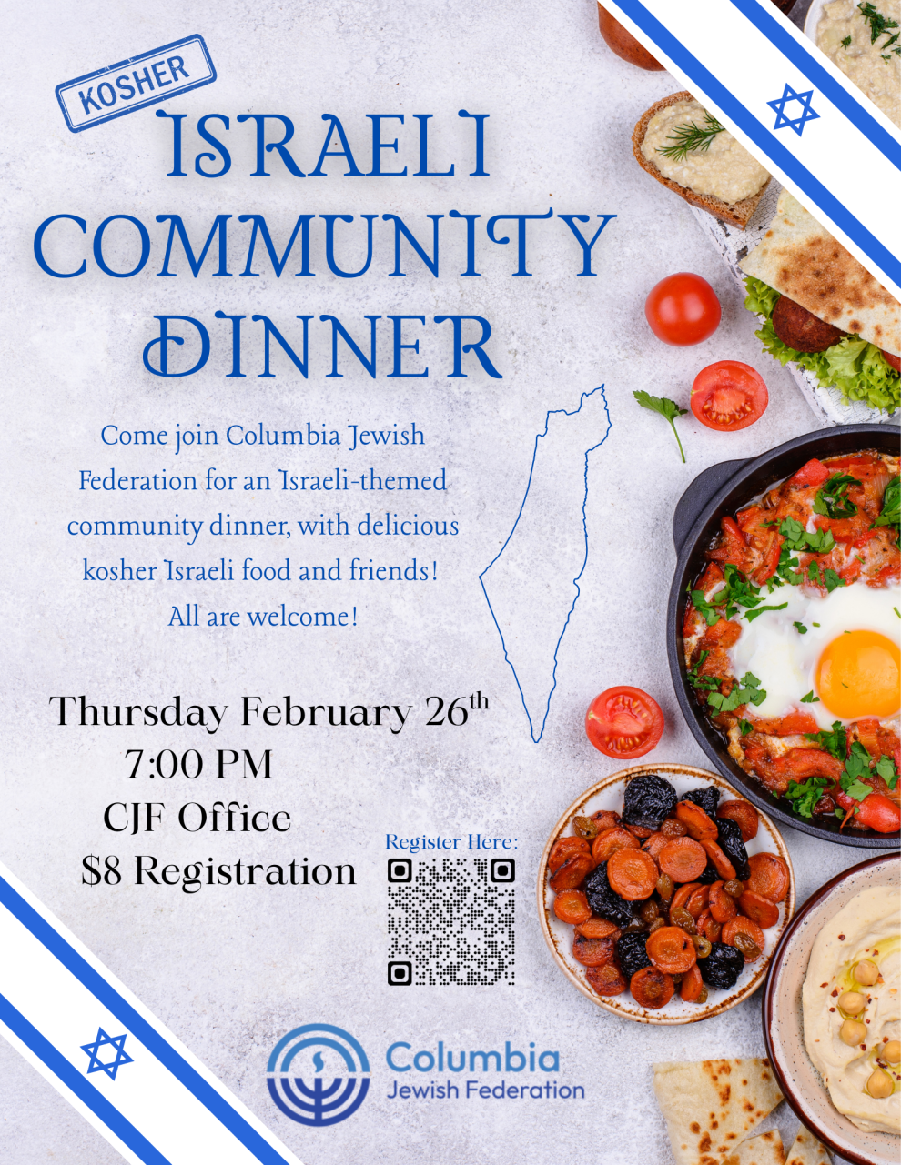 Come join Columbia Jewish Federation for an Israeli-themed community dinner, with delicious kosher Israeli food and friends! All are welcome! Thursday, February 26 7:00PM Columbia Jewish Federation | 2711 Middleburg Dr. Suite 101 $8.00 Israeli Community Dinner