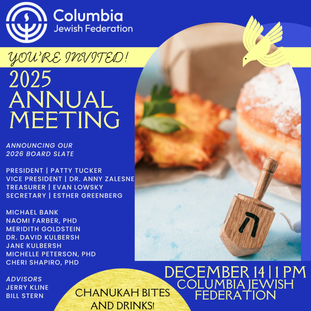 Columbia Jewish Federation 2025 Annual Meeting Sunday, December 14 | 1:00 PM | Columbia Jewish Federation Please join us for our 2025 Annual Meeting, a Chanukah-themed gathering to celebrate all that we’ve built together this year, and the vision we’re carrying forward. This is a time to come together as a community, to reflect on the incredible growth we’ve seen, to welcome new leadership, and to look ahead to all that’s possible when we work side by side. We’ll share light refreshments, Chanukah bites, and time to connect - to honor where we’ve been and the work still ahead. Together, we’re building something lasting. Together, it’s time.
