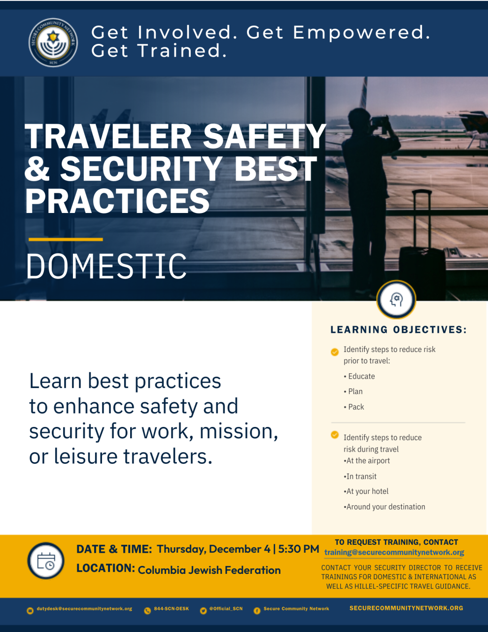 This training is open to all community members and will be led by a certified security professional from Secure Community Network (SCN)—the official safety and security organization of the Jewish community in North America.